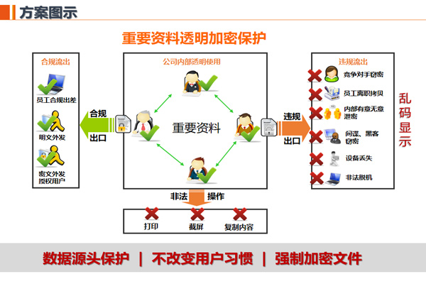 1.加密方式:软件安装后,通过设置加密文件类型的方式,对电脑上现有文件做加密防护,后期电脑上有同类型文件生成,编辑完保存时会自动进入加密状态。加密后的文件,在公司内部大家可以正常使用,没有人授权的情况下,员工不论通过什么方式私自把资料带离公司,到其他电脑上打开都是乱码看不到的。
