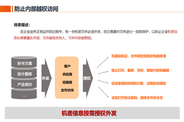 A.解密外发:因工作需要外发给客户的加密资料,通过审批人审批解密后再发给客户,客户才能看得到文件内容。因为文件解密后就是普通文件了,所以发出去之后的安全风险不可控。